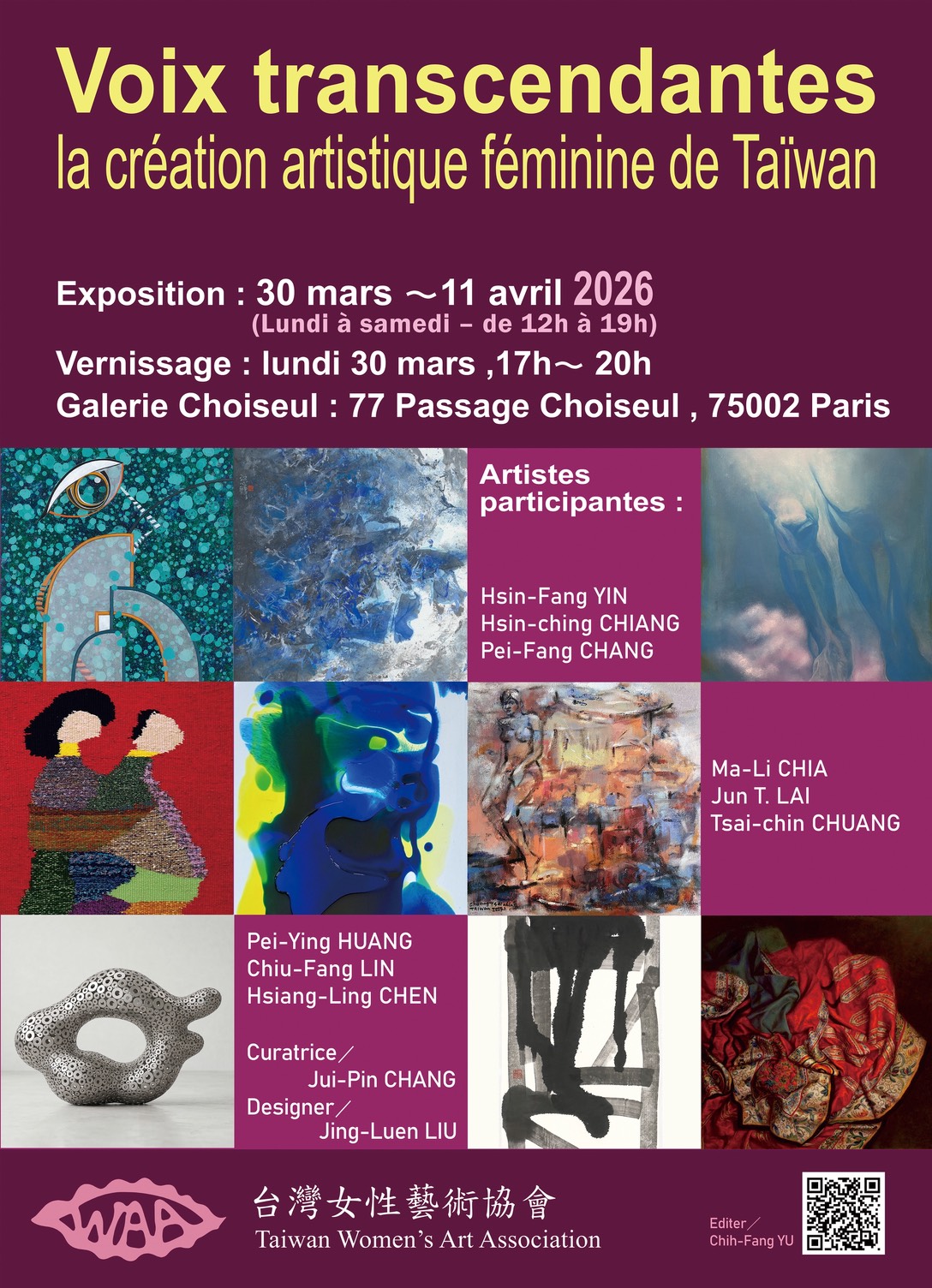 【賴傳媒/記者爆料網/許乃文】【綜合報導】2026 年春天,來自台灣的女性創作聲音將於巴黎歷史街廊中綻放。應法華文化藝術中心(Centre Culturel et Artistique Franco-Chinois)邀請,台灣女性藝術協會將於 3 月 30 日至 4 月 11 日,在巴黎 2 區舒瓦瑟長廊(Passage Choiseul)內的史瓦哲畫廊(Galerie Choiseul)推出《跨越之聲:從島嶼綻放的女性創作》,集結九位台灣女性藝術家的作品,呈現台灣當代女性藝術豐富而多元的創作面貌。
